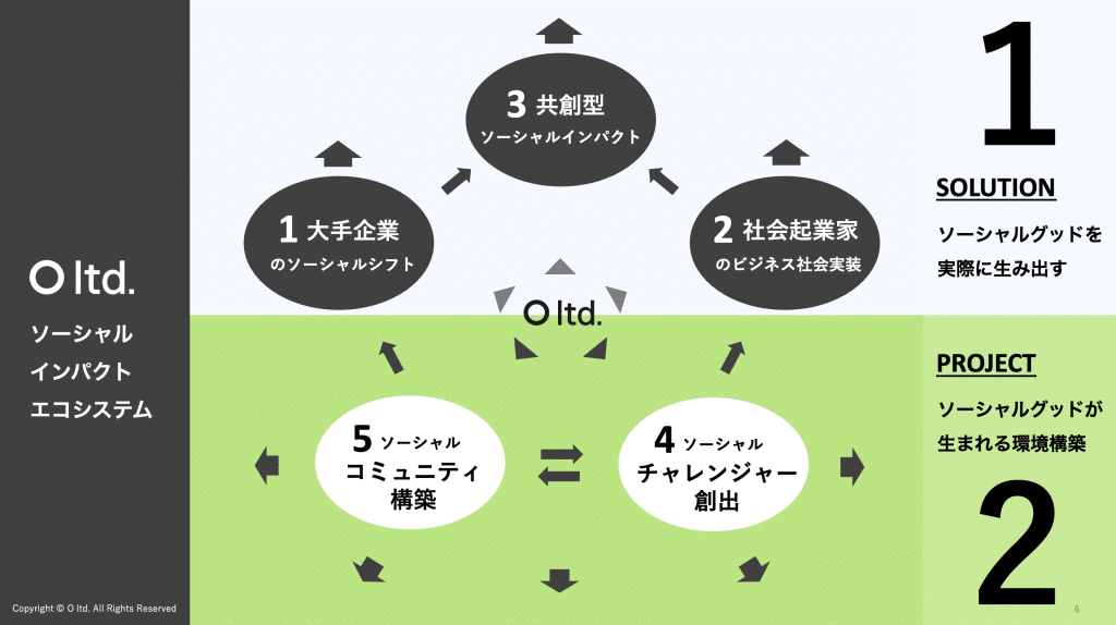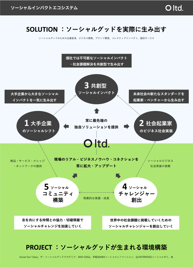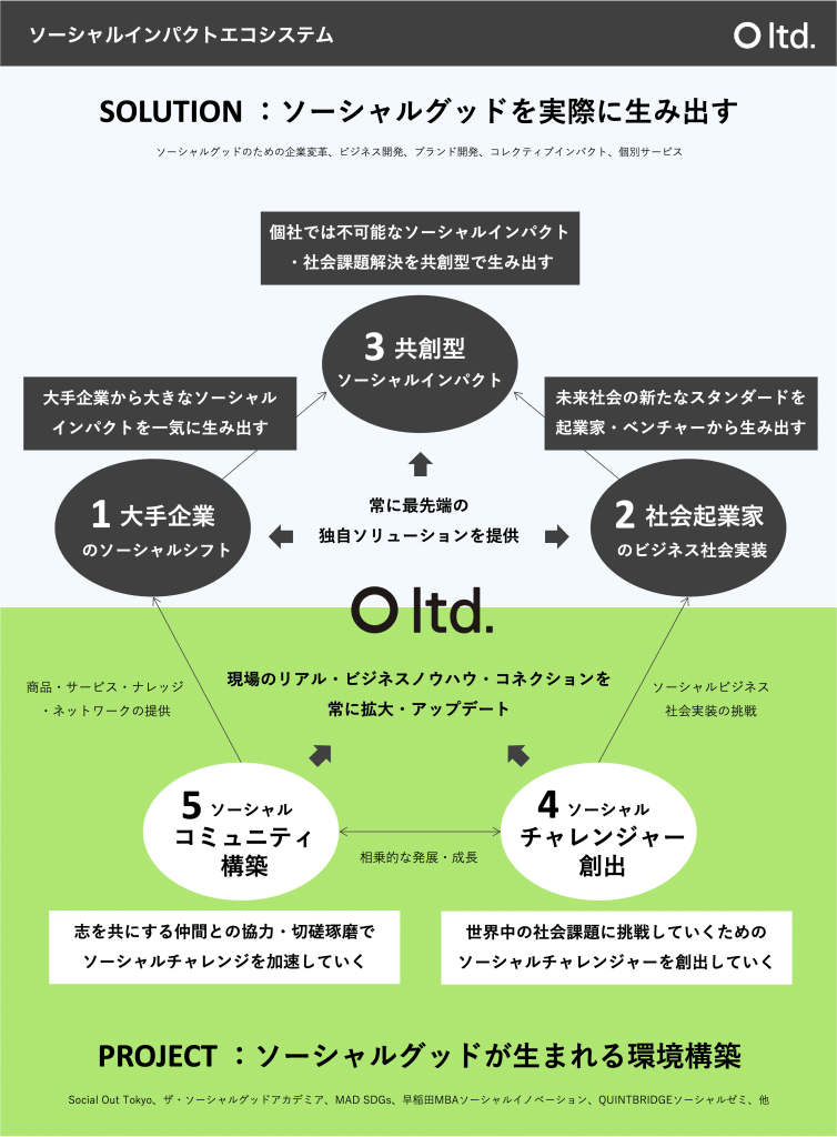 O ltd. は、独自のソーシャルインパクトエコシステムにより、「社会に対する相乗的・ホリスティックなソーシャルグッドの実現」と「クライアントに対する最先端のソーシャルグッドソリューション提供」を可能にしています。