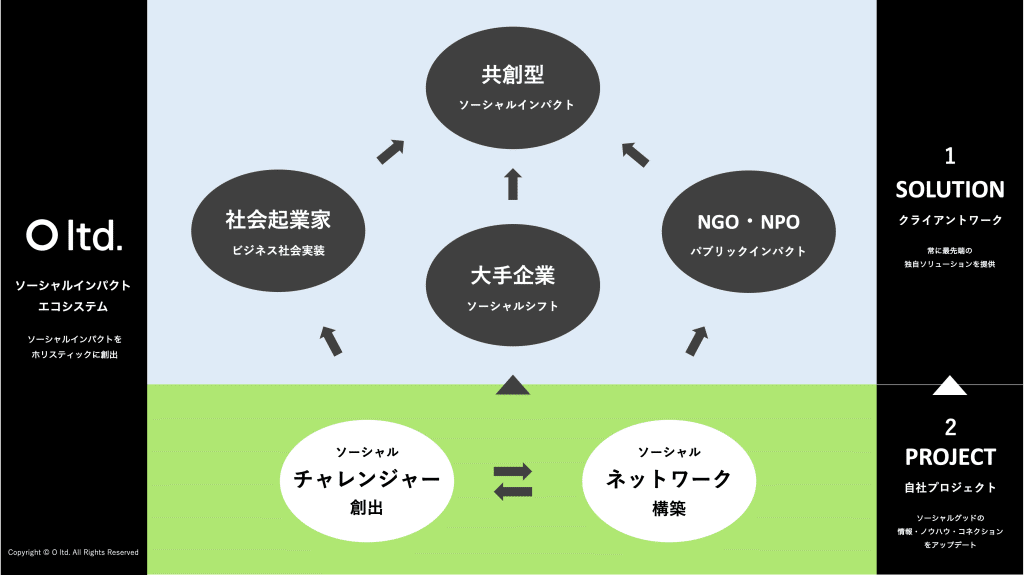 O ltd. は、ありとあらゆる社会課題に挑戦し、社会に大きなソーシャルインパクトとビジネスインパクトを創出し続けるための、独自のソーシャルインパクトエコシステムを設計しています。