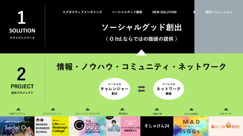 また本エコシステムでアップデートをし続ける、社会課題やソーシャルチャレンジャーの現場のリアル情報、これまでの鉄則とは異なるソーシャルビジネス開発ノウハウ、ソーシャルグッド界隈のありとあらゆるネットワークが O ltd. のコアコンピテンシーとなり、他社にはできない最先端のソーシャルグッドソリューション の提供を可能にしています。