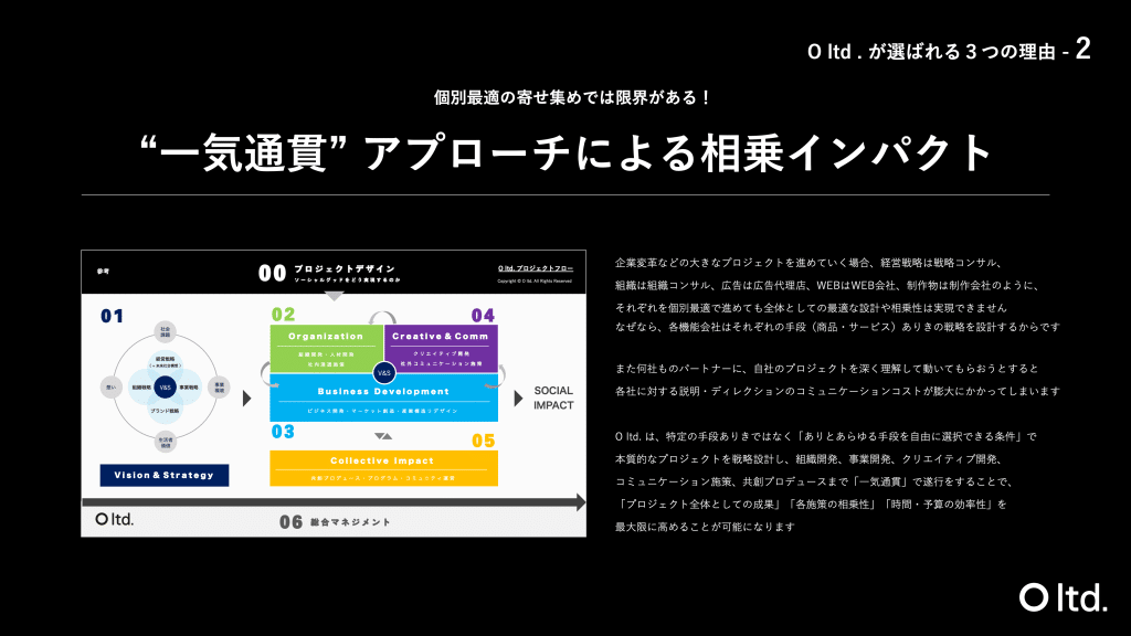 O ltd. は、短期・個別最適のコンサル・代理店的アプローチではなく、中長期・全体最適の事業会社的アプローチを得意としています。あらゆる手段を自由に組み合わせて、プロジェクトを「一気通貫」で設計・遂行することで、「企業全体としての成果」「各施策の相乗性」「時間・予算の効率性」を最大限に高めています