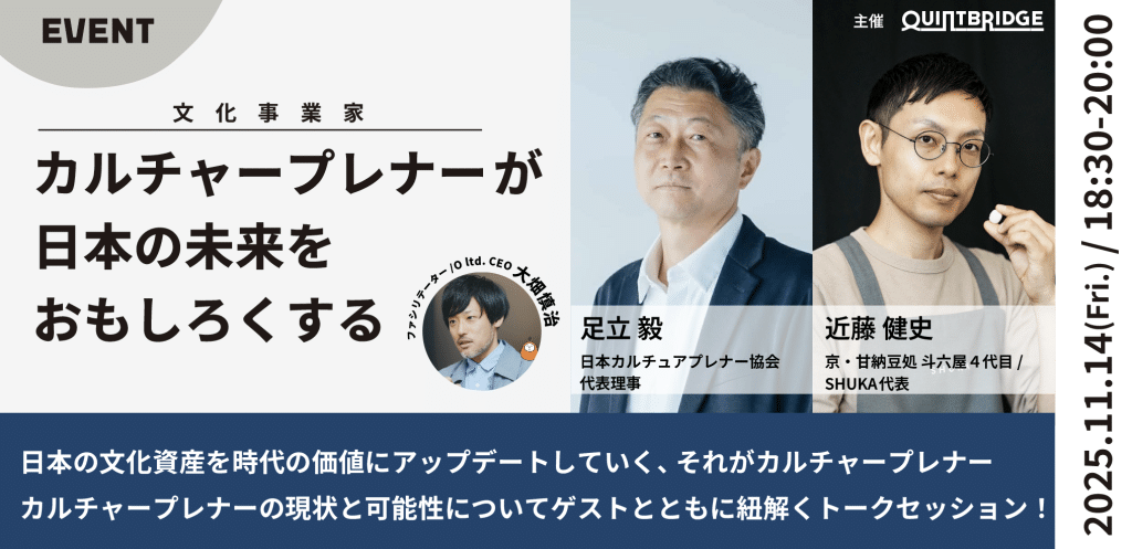 カルチャープレナー(文化起業家)はおもしろい。これまでつちかってきた日本の文化資産をこれからの時代の価値にアップデートしていく、それがカルチャープレナー(文化起業家)。私たちの日常生活や人生を、より豊かで楽しいものにしていくカルチャプレナーの現状とこれからの可能性についてゲストとともに紐解いていきます。