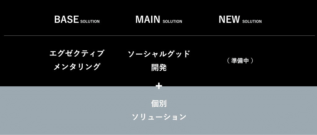 「エクゼクティブメンタリング / 右腕伴走」をベースに、プロジェクト型の「ソーシャルグッド開発」、サービス型の「個別ソリューション」を提供します。