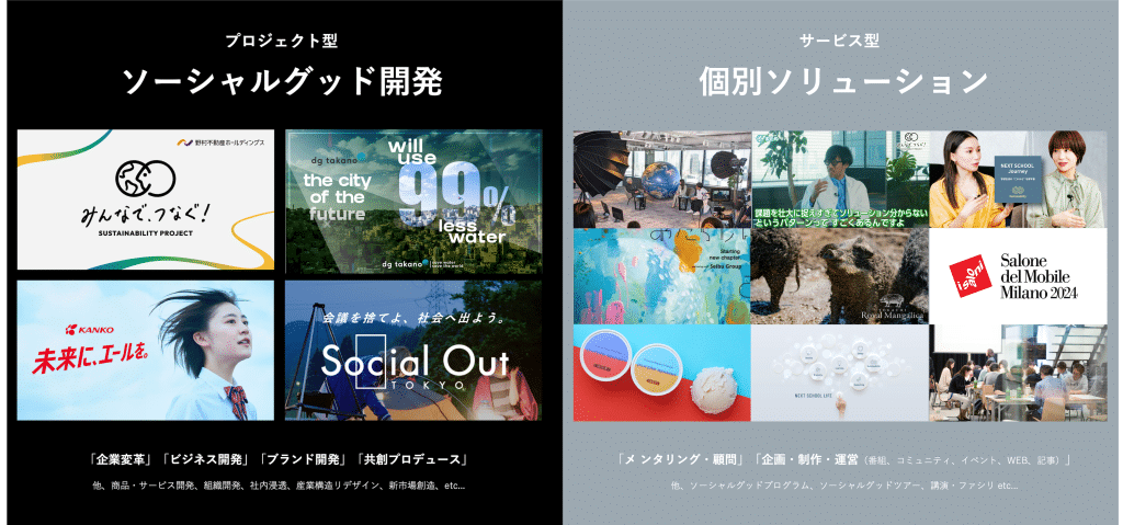 ソーシャルグッド実現のための「企業変革」「ビジネス開発」「ブランド開発」「共創プロデュース」をパートナーとしてビジネスやブランドの開発・共創に中長期で伴走します。